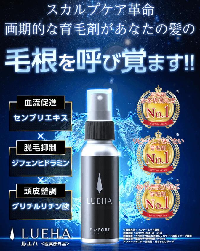 ルエハは、頭皮の炎症を抑えて、血流を改善し、育毛効果が期待できる育毛剤です。頭皮の血行を促進して、成分が浸透しやすくすることで、育毛剤の効果を十二分に発揮できるようにしてくれます。